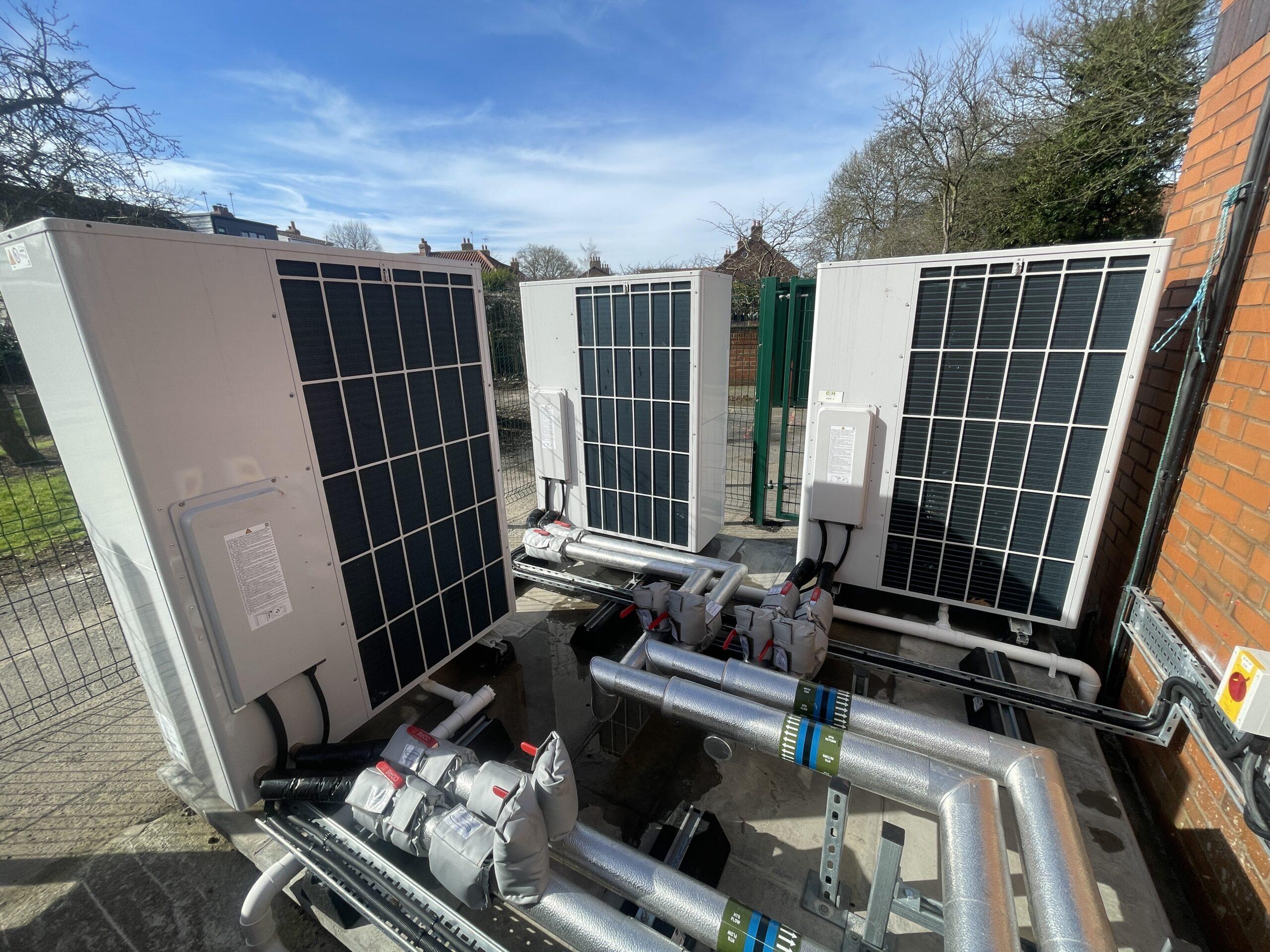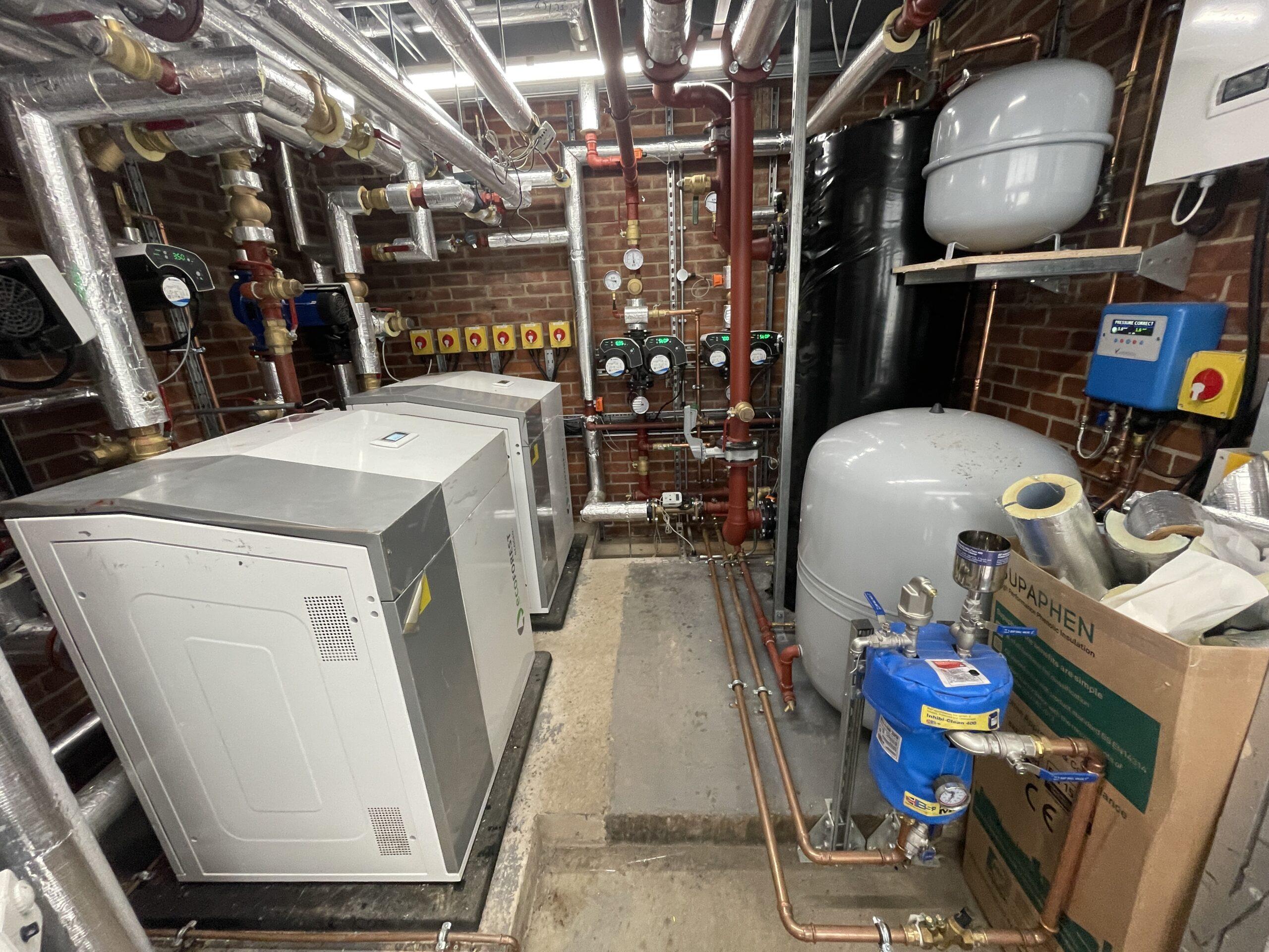 In addition, three Air Source Heat Pump (ASHP) systems were installed, each comprising two duty-assist heat pumps. These systems extract thermal energy from ambient air to heat low temperature hot water (LTHW), now serving as the primary heat source for the buildings.